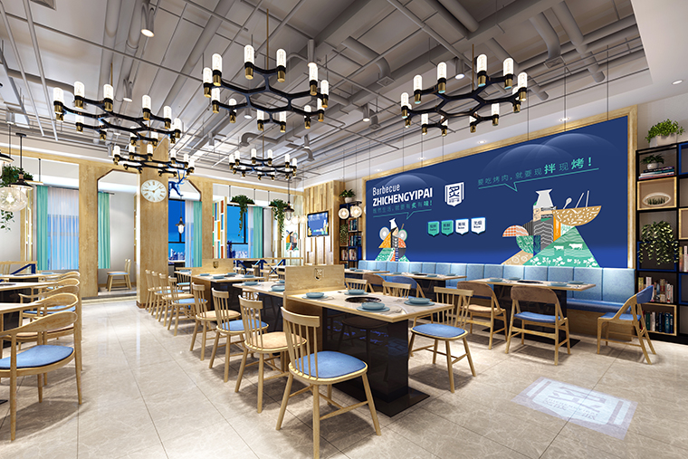2、整體色調:整體色調統一在主色調海藍,天空和大海都是藍色的,所以藍色也給人廣闊、沉靜的感覺。同時藍色也代表著信任與忠誠,藍色可以激發消費者的忠誠情緒??茖W研究表明:主色調為藍色的店鋪比其他藍色的店鋪吸引的老顧客多約15%,炙成一派烤肉餐廳采用天空藍的藍色系,與我們傳達的新鮮,干凈、現拌的出品特質完美契合,使用藍色刻意營造舒適,純凈的用餐氛圍。