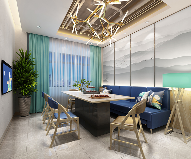 3、家具軟裝:家具是餐飲室內環境的重要部分,因為占地面積大,并且與顧客的接觸最為密切。所以,家具的造型和色彩對餐廳的整體氛圍起著極其重要的影響。炙成一派的家具選擇了與品牌色接近的天藍色,椅子的款項選擇新中式的梳背圈椅,舒適度高,且與整體的空間氛圍極為相稱。其他軟裝如花藝,小包枕,窗簾等,體現空間藝術裝飾性及舒適度之余,還具有趣味性和品牌軟性宣傳。