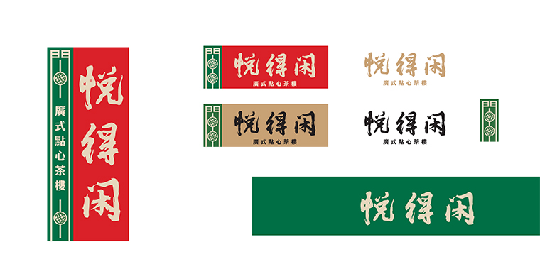 因此,悅得閑的logo我們使用圖形加文字的形式。大紅色的底色上用金色的品牌字,傳遞一種茶樓出品的品質(zhì)感,表示金字招牌之意。左側(cè)綠色色塊上一個原創(chuàng)圖形,取自于得閑飲茶的閑字,將閑字變形,用點心蒸籠的圖形填充,表明了品類屬性也傳達(dá)了得閑飲茶的文化IP。