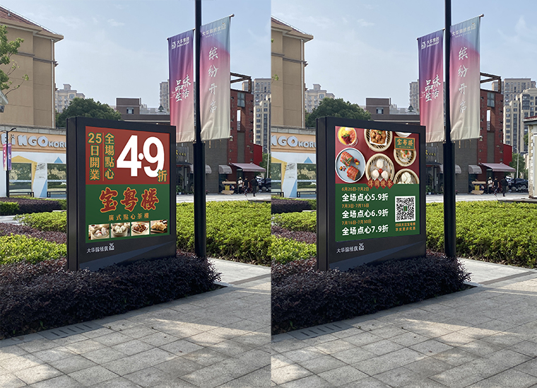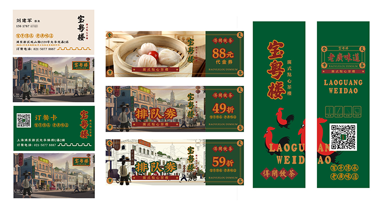 其他的VI如店內(nèi)日常運(yùn)營(yíng)的物料系統(tǒng),導(dǎo)視系統(tǒng),推廣廣告系統(tǒng),品深餐飲設(shè)計(jì)團(tuán)隊(duì)力圖整體空間與品牌完整統(tǒng)一,精細(xì)到連顧客接觸最多的墊餐紙、點(diǎn)餐單、使用的功夫茶具、員工的工衣胸牌、圖片的風(fēng)格,全部統(tǒng)一在寶粵樓的品牌文化體系之內(nèi),給顧客以視覺(jué)整齊劃一又靚麗多變的美學(xué)感受。