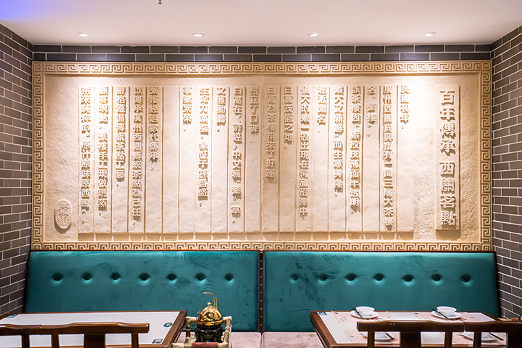 在我們另外一個全案策劃設計項目悅得閑廣式點心茶樓,則始終圍繞廣式早茶文化、得閑飲茶的老廣州休閑美食文化,用墻面雕塑造型,品牌故事上墻,得閑飲茶的霓虹燈裝置來表現(xiàn)。既讓整個用餐空間的廣式茶點休閑氛圍非常濃厚,嶺南文化的品位呈現(xiàn)也非常直觀。