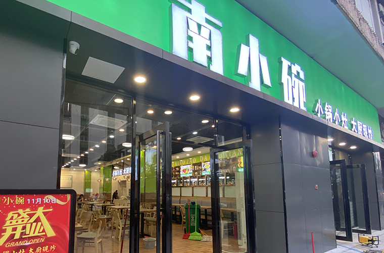 通過前期周密的市場考察和詳細的內部調研,品深餐飲全案設計團隊為南小碗提取了“小鍋小灶,大廚現炒”的核心訴求,并以精心策劃設計的形象畫面在門店形象中不斷放大,重復,讓消費者記憶深刻。南小碗觀瀾店位于富士康時光大道,面積230多平米,主要客群就是富士康的員工。南小碗觀瀾店裝飾一新,環境雅致,菜品新鮮,品種多樣,價格實惠,一經開業,生意火爆。