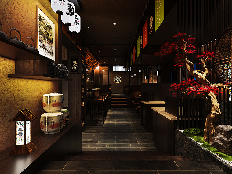 日本料理燒鳥居酒屋餐廳平面布局設計,日本料理空間裝飾效果圖設計,燒鳥居酒屋空間施工圖設計,居酒屋空間軟裝陳列設計,品牌文化植入空間策劃設計