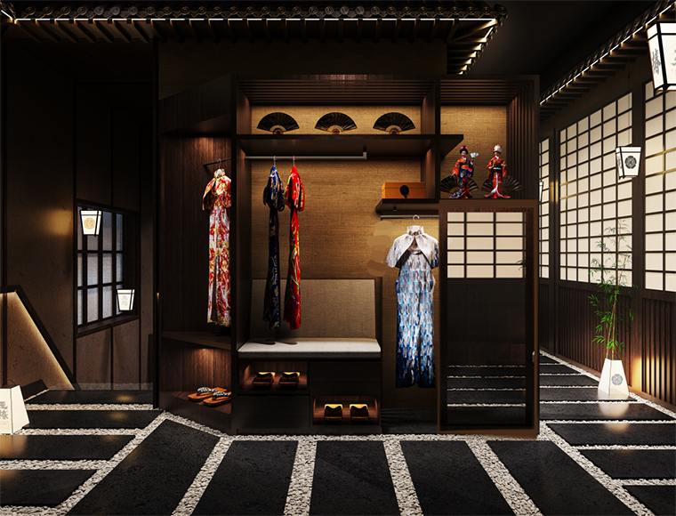 二樓除了必備的洗手間、儲物柜外,還設置了和服展示區,這是餐飲娛樂化的一大重要趨勢。很多女性消費者在日本料理店消費時喜歡穿著和服自拍分享,彰顯個性也很有趣味,可以很好地把我們玉椿品牌傳播出去。品深餐飲設計就順應這種潮流趨勢,擁抱變化,主動設置拍照打卡區,讓消費者傳頌。