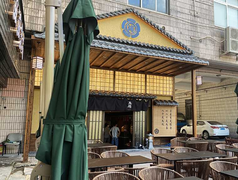 門口的日式推拉門、地燈、青石板、椿花樹、炭黑色的日式布簾、遮蓋燃氣表箱體的竹制卷簾,整個門頭把日本京都特征表達地非常鮮明且形式經典,識別度極高。