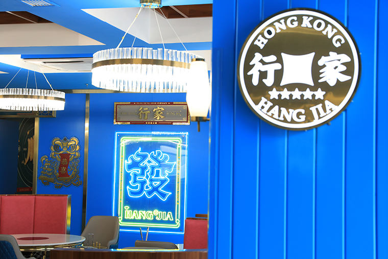 品牌記憶點:南派醒獅+香港海洋藍+玫瑰金不銹鋼+品牌元素在空間中應(yīng)用