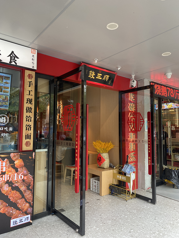1、從門頭設計到門面設計表達,整個門店設計的重心:手工現做饸饹面,這是我們產品的靈魂,也是我們區別于其他連鎖面館產品的核心。康熙賜名,是品牌故事的傳說,也是饸饹面權威背書的一種方式。與門口張貼的非物質文化遺傳美食相呼應,讓消費者對饸饹面有了認知,對錢三順品牌肅然起敬;